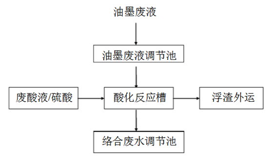 油墨廢液的主要成份為含羥基的樹脂在堿性條件下所生成的有機(jī)酸鹽,而這些含羥基的樹脂不易溶于酸性溶液中。應(yīng)用這一基本性質(zhì),在處理顯影、脫膜廢液時(shí)可采取以廢治廢的方法,利用生產(chǎn)車間排出的廢酸液對(duì)油墨廢液中進(jìn)行酸化處理,不足時(shí)可投加硫酸溶液。