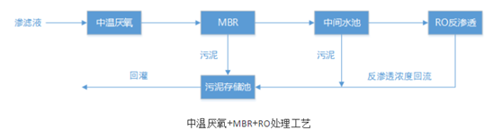滲濾液通過調(diào)節(jié)池流入到中溫厭氧池,經(jīng)大分子有機(jī)污染物降解后進(jìn)入缺氧段MBR反應(yīng)器中,與回流水混合進(jìn)入好氧段MBR進(jìn)行曝氣,去除滲濾液中的TN,好氧池出水進(jìn)入MBR分離器,將分離的污泥濃液回流至MBR缺氧段,MBR出水進(jìn)入反滲透系統(tǒng),滲濾液經(jīng)反滲透處理后實(shí)現(xiàn)達(dá)標(biāo)排放。