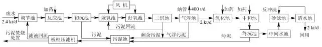 面對新的生產情況及《浙江省印染行業淘汰落后整治提升方案》要求,企業決定對現有廢水處理設施進行擴建、改造,并增加回用水處理設施,實現50%的中水回用率。工程總設計水量為4000m3/d,其中在原有污水站設計能力2400m3/d的基礎上新增設計水量1600m3/d。