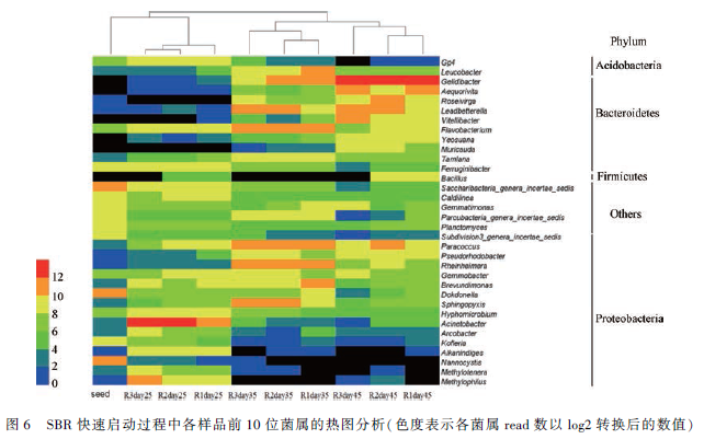 對(duì)SBR 中活性污泥進(jìn)行了高通量測(cè)序用于揭示反應(yīng)器菌群結(jié)構(gòu)演替以及復(fù)合菌劑的存留狀況。群落結(jié)構(gòu)分析的4 組實(shí)驗(yàn)包括配入高鹽廢水前期(R1、R2 和R3 完成接種后在相同條件下運(yùn)行,樣品編號(hào)Rday15),連續(xù)投加復(fù)合菌劑的R1 組(樣品編號(hào)R1 day25、R1 day35、R1 day45),連續(xù)投加復(fù)合菌劑的固定化填料的R2 組(樣品編號(hào)R2 day25、R2 day35、R2 day45);連續(xù)投加活性污泥的R3 組(樣品編號(hào)R3day25、R3 day35、R3 day45)。不同處理組及采樣階段,菌門(mén)水平變化如圖5 所示。活性污泥微生物中含量較多的為變形菌門(mén)( Proteobacteri) 和擬桿菌門(mén)( Bacteroidetes),其所占比例較高,分別達(dá)到40. 45% 、27. 05% 、4. 69% 和4. 22% 。在整個(gè)生物處理啟動(dòng)過(guò)程中,高鹽廢水對(duì)活性污泥的馴化以及復(fù)合菌劑的投入使活性污泥微生物群落結(jié)構(gòu)發(fā)生了明顯的改變。活性污泥中主要微生物比例發(fā)生了明顯改變,R1、R2 和R3 中變形菌門(mén)所占比例均出現(xiàn)驟增,分別達(dá)到56. 24% 、56. 22% 和63. 72% ,擬桿菌門(mén)所占比例則分別降低至16. 11% 、19. 40% 和17. 68% 。對(duì)于R1 和R2,從運(yùn)行第10 天至15 天連續(xù)投加了復(fù)合菌劑和負(fù)載復(fù)合菌劑的填料,所以R1 和R2 中厚壁菌門(mén)所占比例從1. 31% 分別升高至6. 13% 和4. 54% ;對(duì)于R3,由于僅投入活性污泥種泥,其中的厚壁菌門(mén)所占比例在運(yùn)行45 d 僅有0. 95% 。這說(shuō)明地衣芽孢桿菌(Bacillus licheniformis) O1 和枯草芽孢桿菌(Bacillus subtilis) Y5 所屬的厚壁菌門(mén)雖然具有較強(qiáng)的耐鹽性,但不具備競(jìng)爭(zhēng)優(yōu)勢(shì),通過(guò)復(fù)合菌劑投加,可以在活性污泥總富集,并成為優(yōu)勢(shì)種屬。